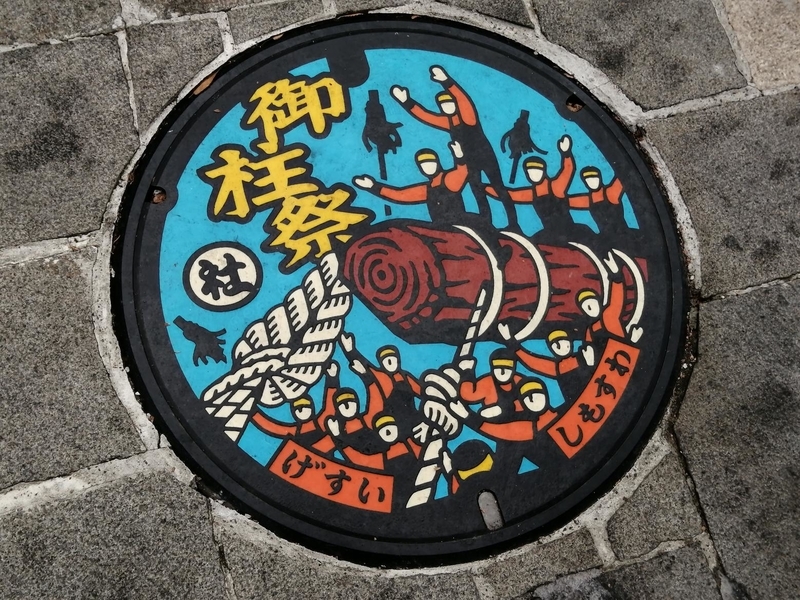 ちなみに、こちらは近くにあるマンホール。諏訪の奇祭「御柱祭」をモチーフにしたデザインになっていて、「マンホールカード」にもなっています。